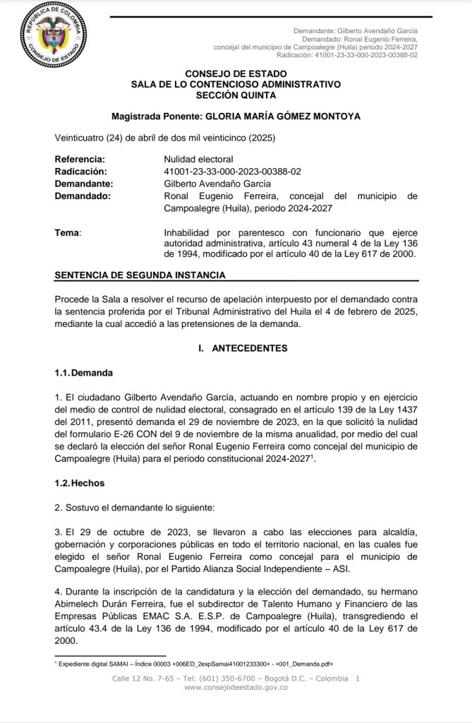 • El actual presidente del Concejo Municipal de Campoalegre, Ronal Eugenio Ferreira, deberá dejar su cargo luego de que el Consejo de Estado confirmara la nulidad de su elección como concejal para el periodo 2024-2027. La decisión se basa en una inhabilidad por parentesco con un funcionario que ejercía autoridad administrativa en el municipio durante el año previo a las elecciones.