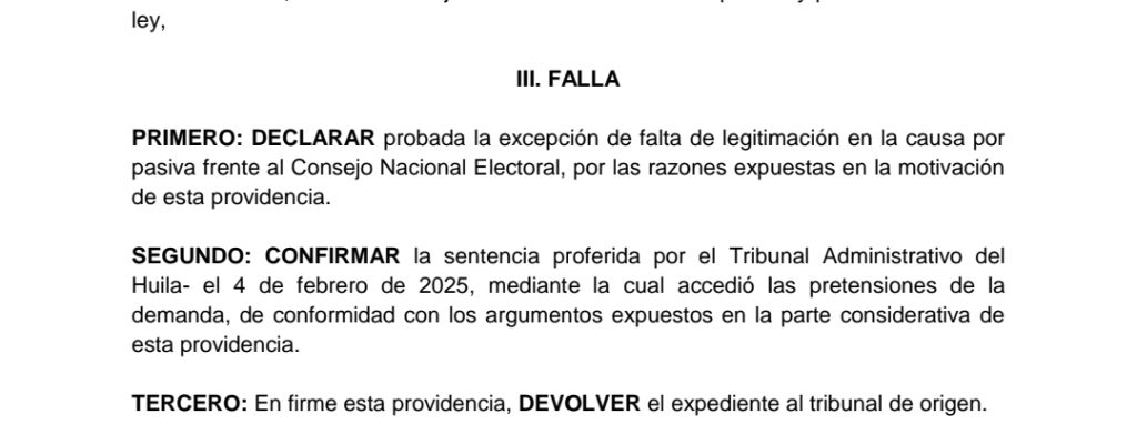 En consecuencia, se confirmó el fallo emitido por el Tribunal Administrativo del Huila el pasado 4 de febrero de 2025, y se ordenó la asignación de la curul a la candidata que siguió en votación dentro de la lista del partido ASI, Gloria Cortés, quien obtuvo 335 votos frente a los 353 de Ferreira.
