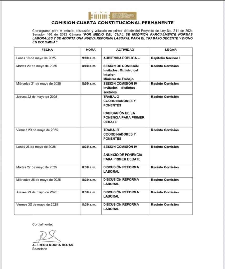 Este jueves 15 de mayo de 2025 se conoció el documento en el que la Comisión Cuarta del Senado de la República confirmó cuál será el cronograma para que se desarrolle el tercer debate de la reforma laboral, que resucitó en la plenaria de la corporación durante la sesión del miércoles cuando se hundió la Consulta Popular.