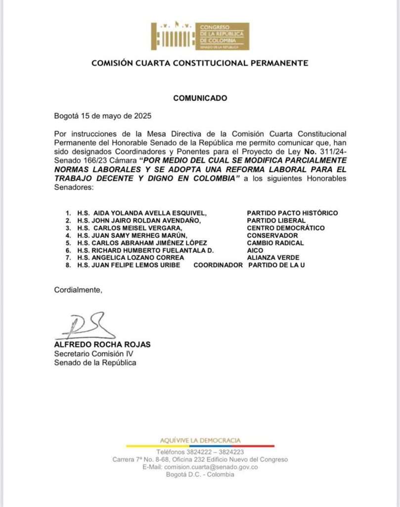De acuerdo con el documento fueron designados estos senadores: Aida Avella, del Pacto Histórico; John Jairo Roldán Avendaño, del Partido Liberal; Carlos Meisel, del Centro Democrático; Juan Samy Merheg, del Partido Conservador; Carlos Abraham Jiménez, de Cambio Radical; Richard Humberto Fuelantala, de Aico; Angélica Lozano, de Alianza Verde y Juan Felipe Lemos, del partido de La U. De acuerdo con el documento de la Comisión Cuarta, este último congresista será el coordinador para la discusión del proyecto de ley.