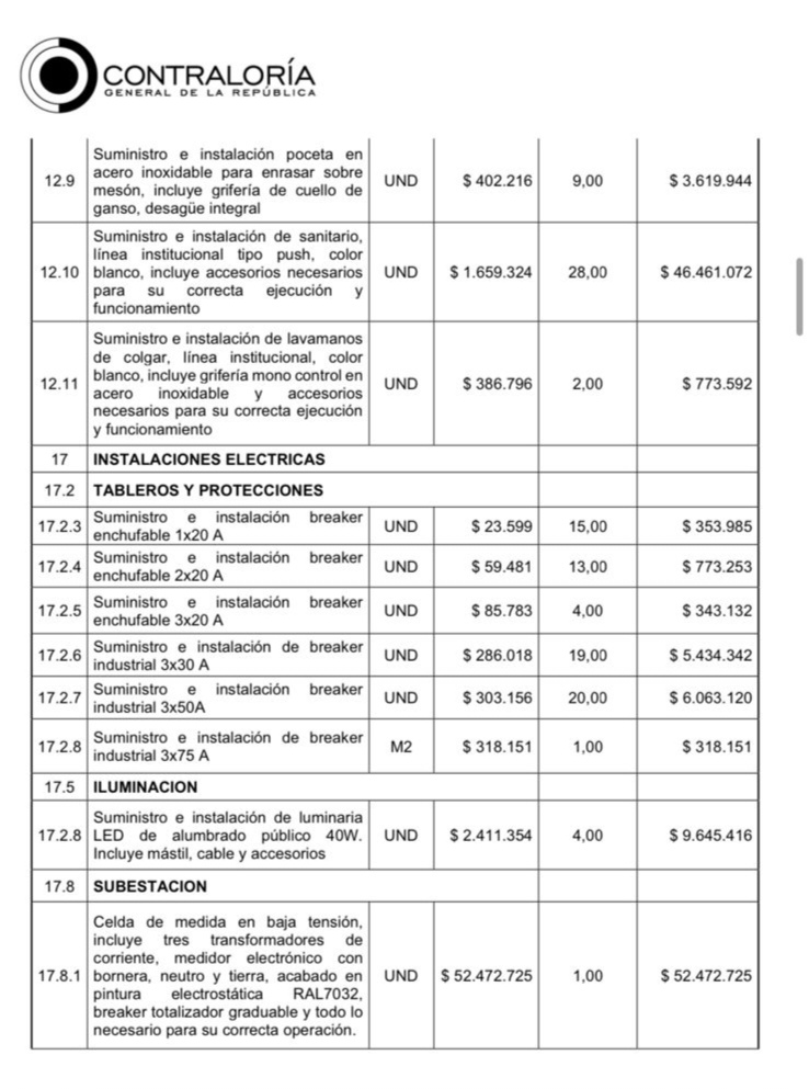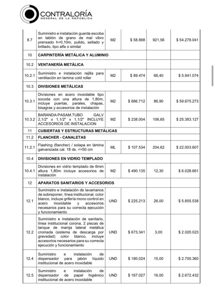 Se estableció que ítems estipulados y pagados hasta el acta de recibo parcial de obra No. 10, no se han ejecutado en la obra, tales como el piso en cerámica, enchape de pared, sanitarios, lavamanos, orinales, duchas, dispensadores, barras de seguridad y divisiones en acero inoxidable en las baterías sanitarias, guardaescobas media caña en el laboratorio, rejillas de ventilación, solapas en lámina galvanizada, barandas metálicas, posetas en acero inoxidable y divisiones en vidrio, iluminación led de alumbrado público, celda de medida y tablero de distribución en la subestación, y apantallamiento. Así se relaciona en el informe de auditoría.