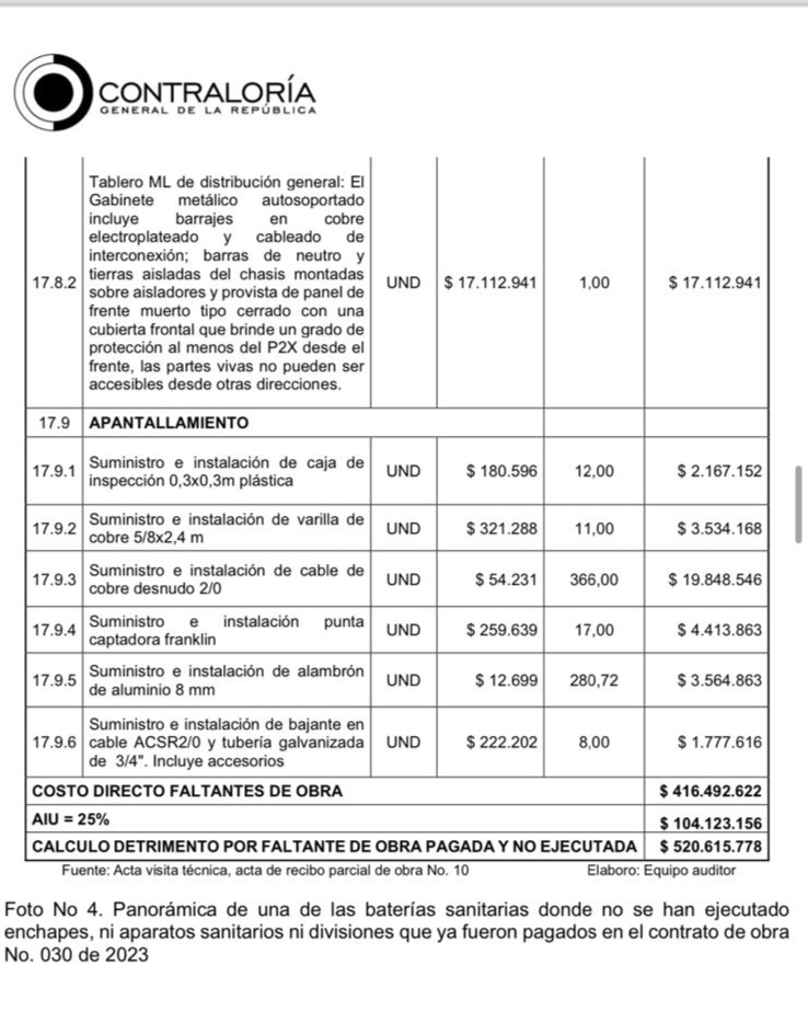 “La situación observada constituye detrimento a los recursos públicos que, de acuerdo con las condiciones contratadas y los cálculos de la CGR, está valorado en quinientos veinte millones seiscientos quince mil setecientos setenta y ocho pesos m/cte. $520.615.778, como se detalla a continuación: La placa de entrepiso entre el segundo y tercer piso del bloque de aulas 1 presenta agrietamientos y empozamientos de agua, lo cual hace que se presenten filtraciones de agua sobre el segundo piso, la deficiencia se presenta en el área 478.25 m². Esta placa al no construirse mediante el contrato No. 030 de 2023 el tercer piso del bloque de aulas queda como placa de cubierta”, evidencia el informe.