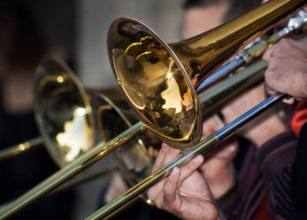 Close-up view of musicians playing trombones. Focus on the foreground, trombone bell.