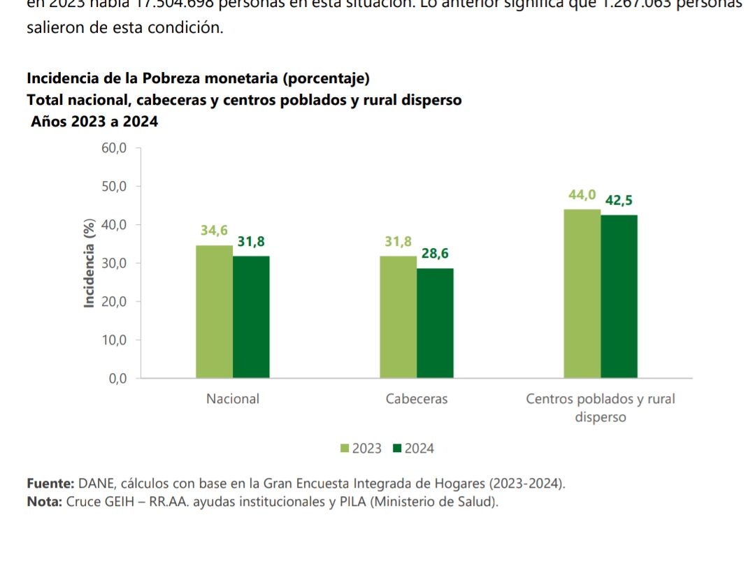 Así, la incidencia de la pobreza alcanzó el 31,8 % en 2024 en el total nacional, el mínimo visto desde 2012, cuando comenzó la serie que es comparable. Esta cifra se ubica 2,8 puntos porcentuales (pp) por debajo del 34,6 % registrado el año anterior.