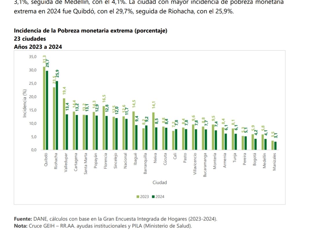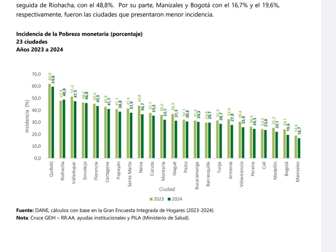 En 2024, las ciudades que experimentaron mayor pobreza monetaria fueron Quibdó con el 59,6%, seguida de Riohacha, con el 48,8%. Por su parte, Manizales y Bogotá con el 16,7% y el 19,6%, respectivamente, fueron las ciudades que presentaron menor incidencia.