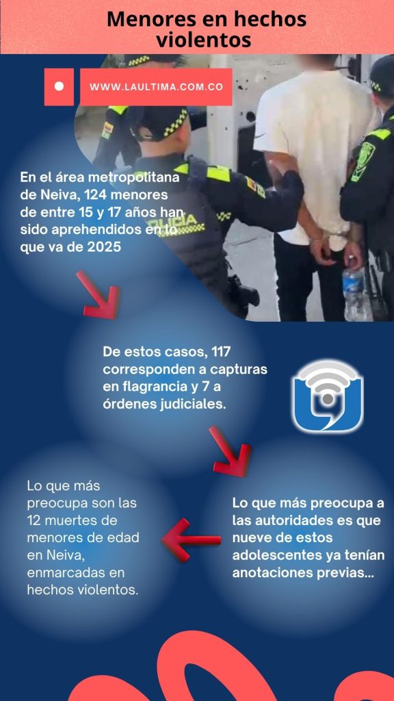 En el área metropolitana de Neiva, 124 menores de entre 15 y 17 años han sido aprehendidos en lo que va de 2025 por delitos como tráfico de estupefacientes, hurto, porte ilegal de armas e incluso homicidio. De estos casos, 117 corresponden a capturas en flagrancia y 7 a órdenes judiciales. Lo que más preocupa a las autoridades es que nueve de estos adolescentes ya tenían anotaciones previas, y que algunos de los menores fallecidos también habían estado vinculados a hechos delictivos.