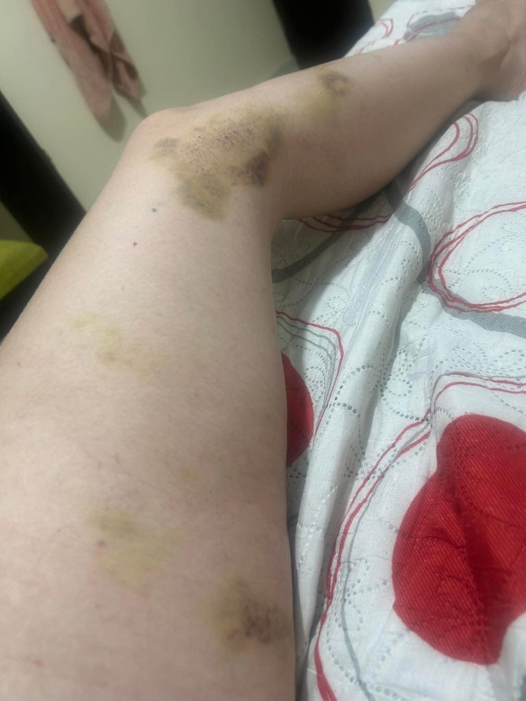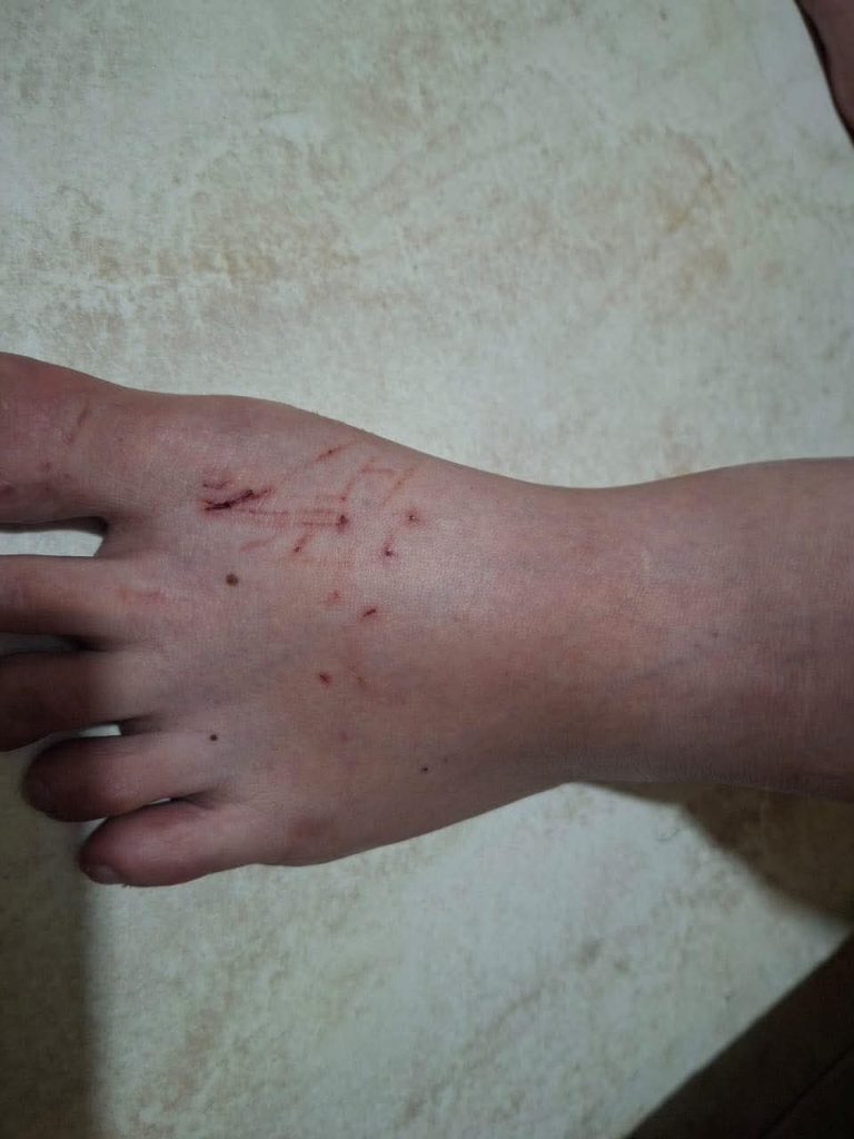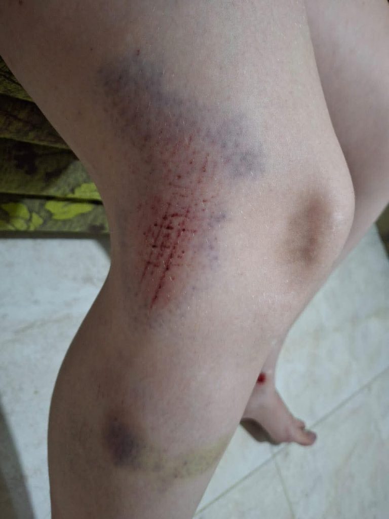 “Recurro al CAI de granjas para colocar la queja y posteriormente me voy por urgencias a la Policlínica en donde relato lo sucedido en donde el agresor me jala el cabello me agrede físicamente y verbalmente, me tira por las escaleras provocándome edemas a nivel de rodilla derecha y tobillo izquierdo. Escoriaciones a nivel de ante brazo derecho, muslo derecho y pierna derecha, denuncio esto hechos ya que son gravísimos