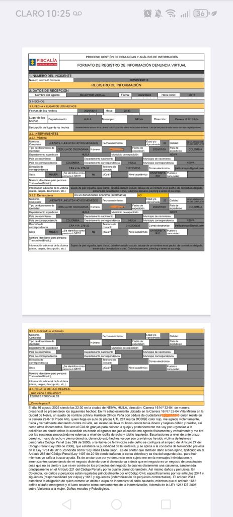 El agresor fue denunciado ante la Fiscalía General de la Nación por el delito de lesiones personales y fue identificado como Johnny Harrison Olmos Peña.