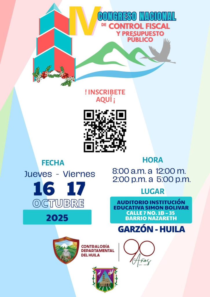 La Contraloría Departamental del Huila se descentraliza para realizar en Garzón el Cuarto Congreso Nacional de Control Fiscal, Presupuesto Público y Evasión Fiscal, los días jueves 16 y viernes 17 de octubre.