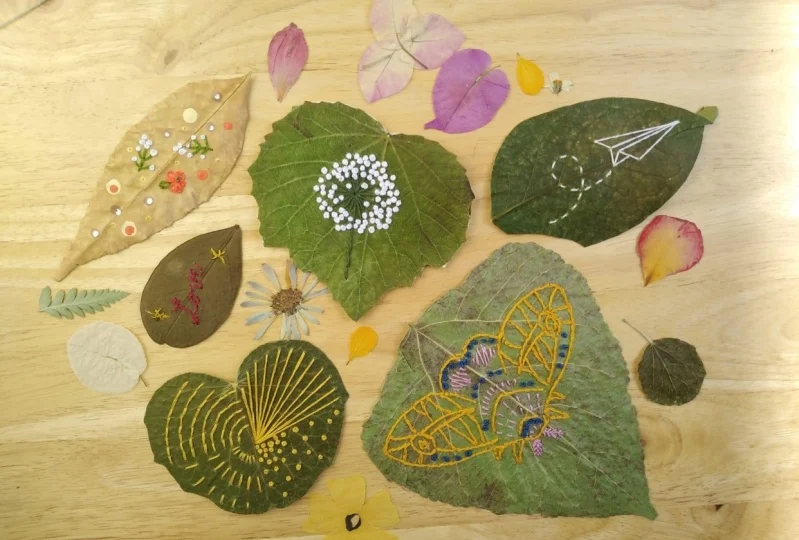 La actividad, denominada “Retiendos, memorias de los árboles a través del tejido”, invita a los participantes a intervenir hojas reales con agujas e hilos de colores, utilizando puntadas básicas para crear figuras simbólicas como corazones, espirales, plumas o formas libres. La propuesta apunta a que cada persona pueda representar recuerdos, emociones o ideas a partir del trabajo manual.