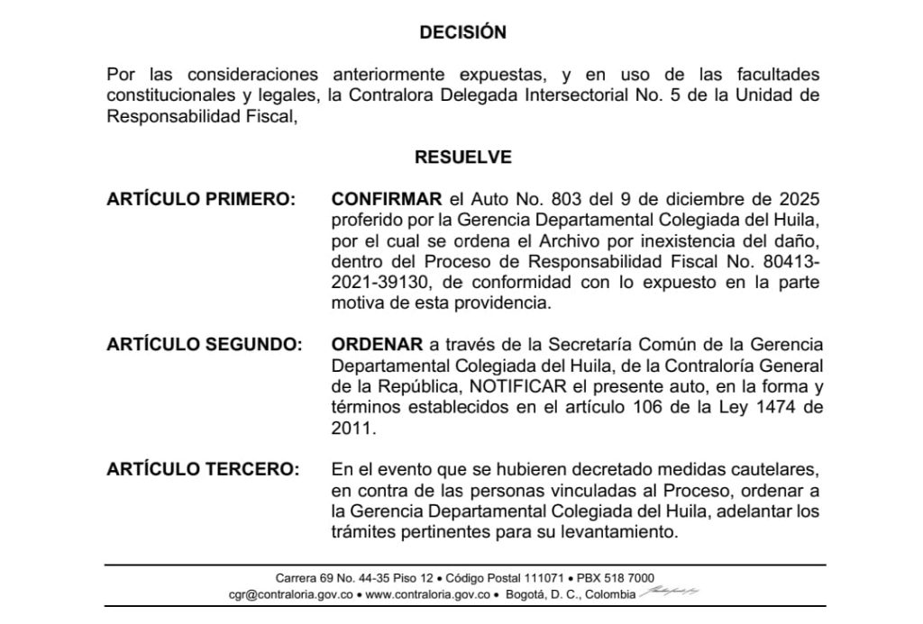 La Contraloría General de la República, a través de la Contraloría Delegada Intersectorial No. 5 de la Unidad de Responsabilidad Fiscal, confirmó mediante el Auto No. URF2–1879 del 30 de diciembre de 2025, el archivo definitivo del Proceso Ordinario de Responsabilidad Fiscal PRF No. 80413-2021-39130, al concluir que no existió daño patrimonial al Municipio de Neiva en la ejecución del Contrato de Suministro No. 1093 de 2020, correspondiente al Programa de Alimentación Escolar (PAE).