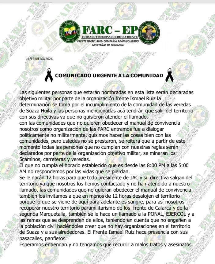 Mientras avanzaban las diligencias judiciales, en el municipio comenzó a circular un panfleto fechado el 14 de febrero de 2026 y firmado por el autodenominado Frente Ismael Ruiz – Compañía Adán Izquierdo. En el documento, el grupo armado declara como “objetivo militar” a varios presidentes y directivos de juntas de acción comunal de diferentes veredas y sectores de Suaza.