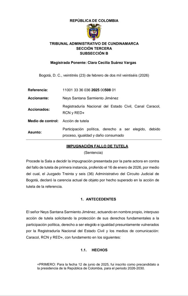 El juzgado declaró la existencia de un hecho superado al considerar que se habían otorgado alternativas para cumplir con el trámite. La decisión fue impugnada y revisada por el Tribunal Administrativo, que, según Santana, reconoció errores y omisiones en el procedimiento, aunque concluyó que el avance del calendario electoral impedía emitir una orden que permitiera materializar la inscripción. “La magistrada manifestó que habían vulnerado todos los derechos, pero que ya no podían darle cumplimiento a una orden judicial”, explicó.