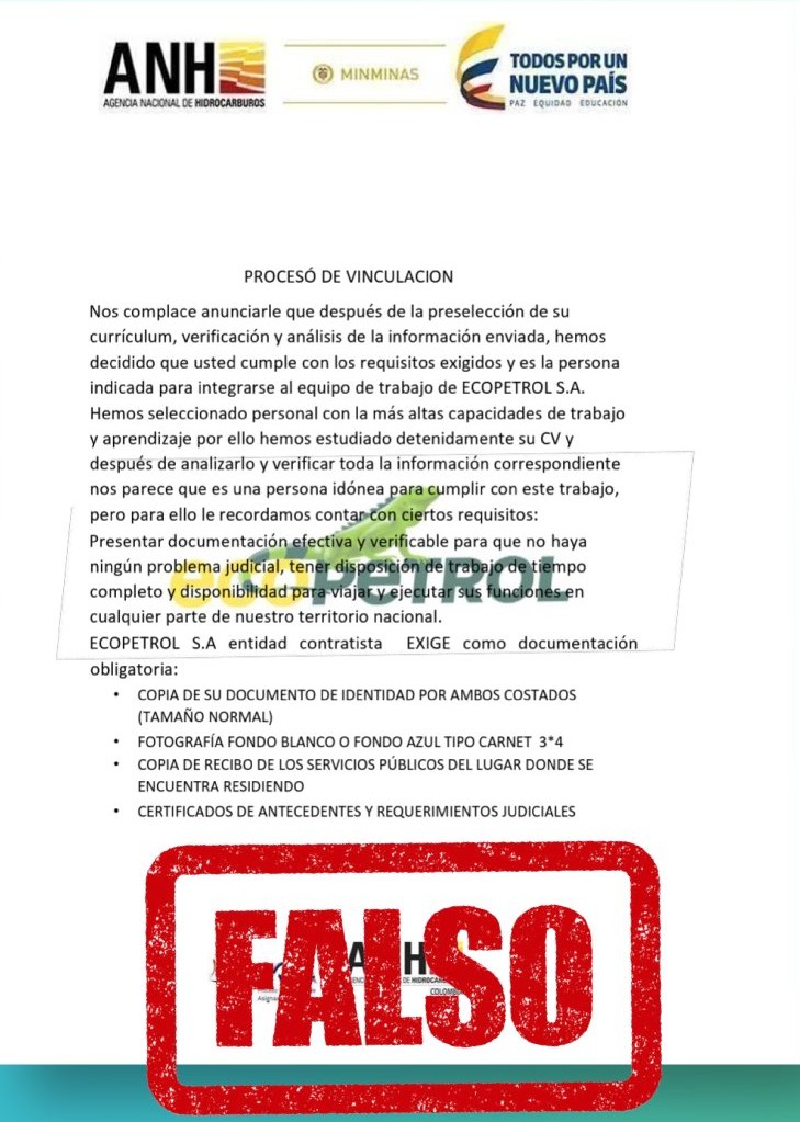 Ecopetrol informa a la opinión pública que, ante denuncias que se han venido presentando en el departamento del Huila, se han identificado casos de personas inescrupulosas que están utilizando de manera indebida el nombre y los logos de la compañía, la Agencia Nacional de Hidrocarburos (ANH) y el Ministerio de Minas y Energía, con el fin de engañar a la ciudadanía a través de falsas convocatorias laborales.